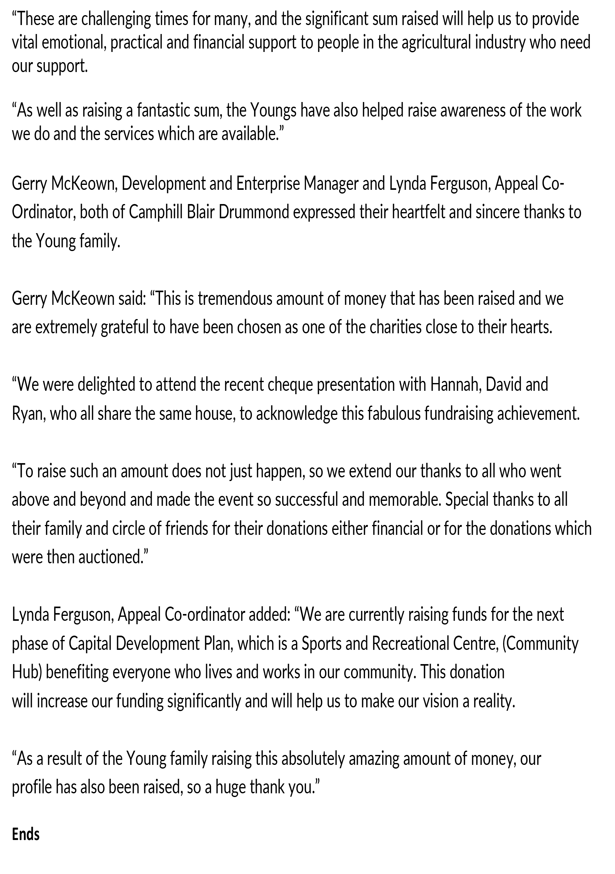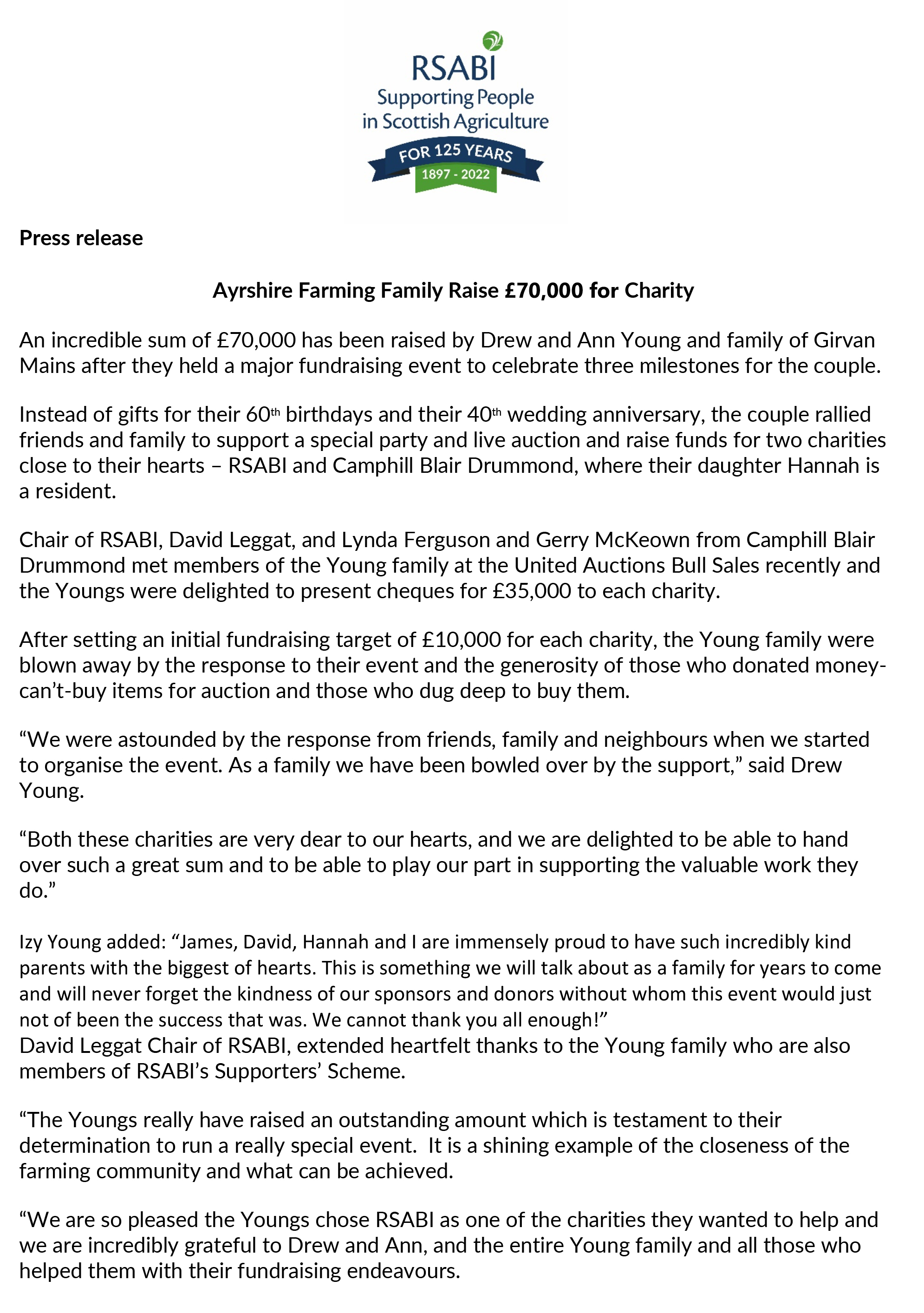 Ann and Drew Young for their £35,000 donation raised from a fundraising in June event to celebrate their Ruby wedding anniversary and joint 60th birthdays. They decided to hold a charity bash rather than receive any gifts. – Their Just Giving fundraising page is still open if you would like to make a donation.